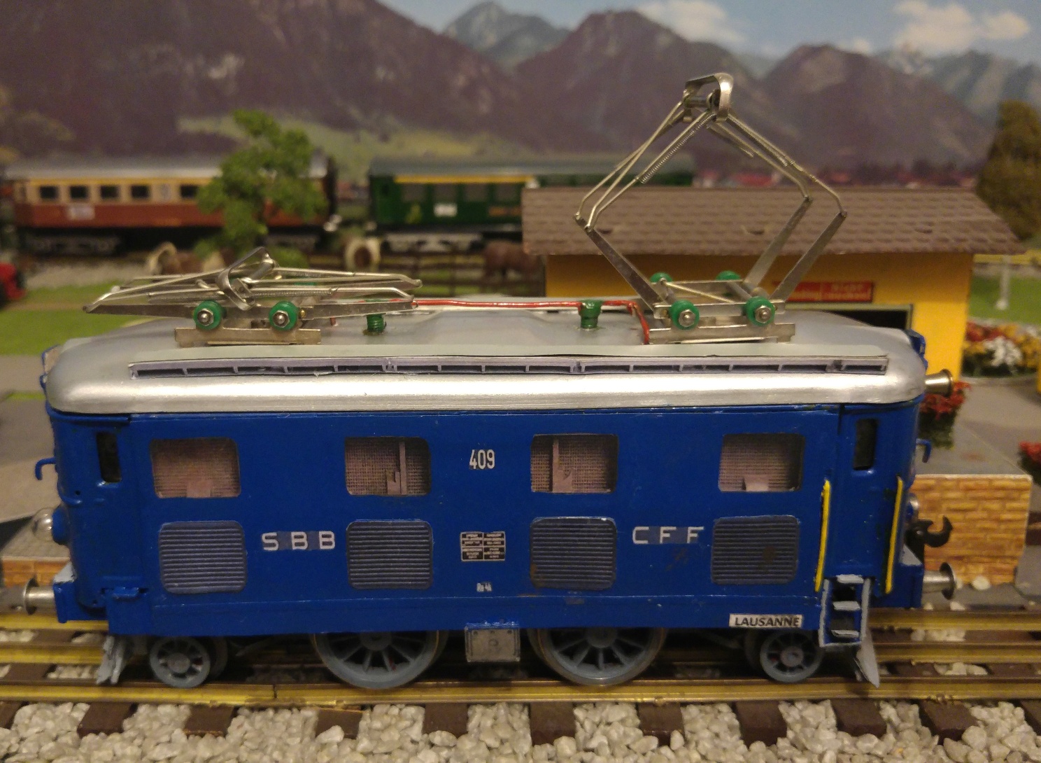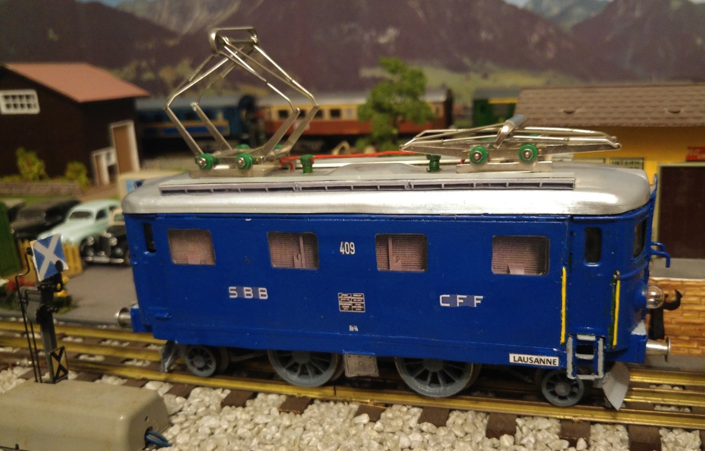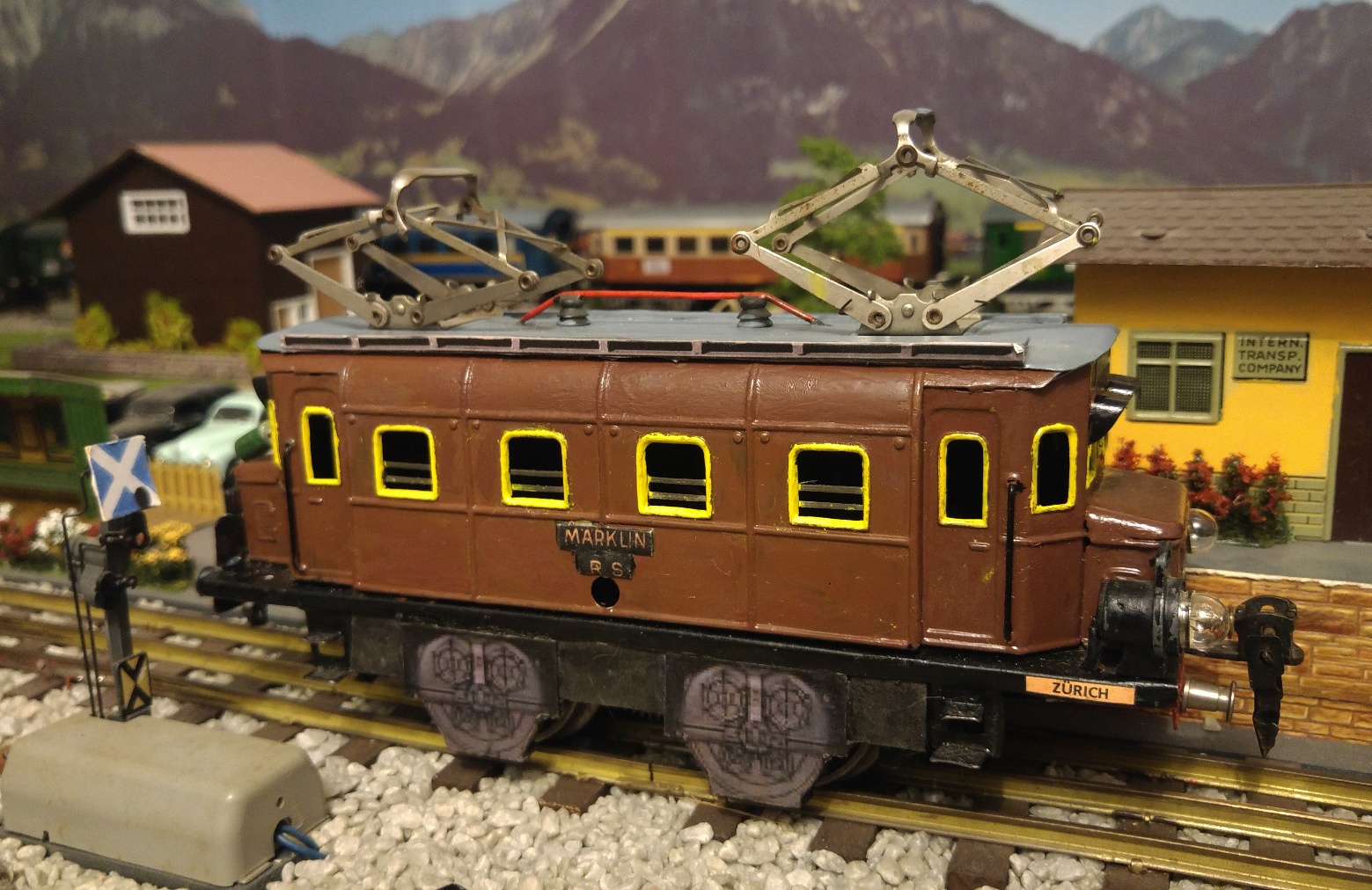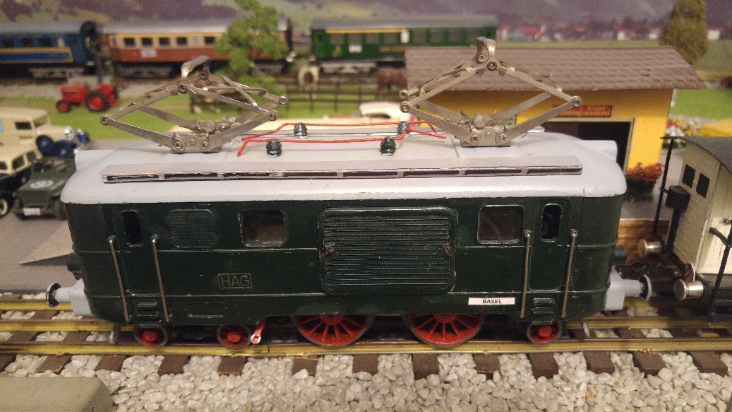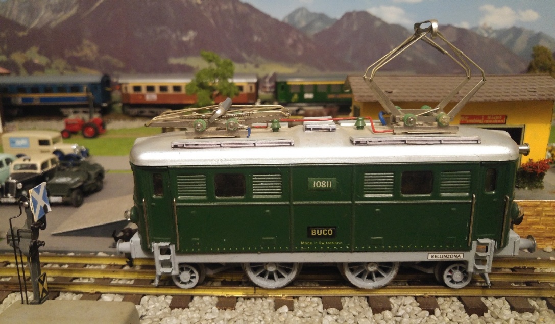 Tout en veillant à toujours respecter le style ferroviaire « Tinplate 0 », lorsque j’ai terminé la sublimation de mes locomotives BUCO du type 314 L, renumérotées par mes soins en 10805 et 10811, à droite sur les longerons latéraux du châssis, j’ai immédiatement confectionné et appliqué les plaques de dépôt les concernant, soit : 10805 = ERSTFELD et 10811 = BELLINZONA. Désormais, toutes mes locomotives sont munies de ces fameuses plaques, soit : RS 65/13050, RS 66/12910 et RS 66/12920 de MAERKLIN, 1101 de HAG et 409 (ex BUCO 304). Dans la réalité, jusqu’aux locomotives CFF du type Ae 4/7 en 1935, les plaques de dépôt étaient en laiton naturel, alors que les noms des dépôts y figuraient « en creux », en majuscules à la couleur noire ; dès les véhicules-moteurs Am 4/4 1001 et 1002, Ae 8/14 11852, RFe 4/4 601 à 603, Am 4/6 1101, Ae 4/6 10801 à 10812 et suivantes jusqu’à nos jours, locomotives Re 6/6 comprises, les plaques étaient désormais en aluminium en lieu et place du laiton ; actuellement, par suite de la banalisation des véhicules-moteurs sur l’ensemble des lignes CFF, les plaques de dépôt ont hélas disparu des locomotives actuelles, ne figurant par contre plus que sur les véhicules-moteurs historiques.