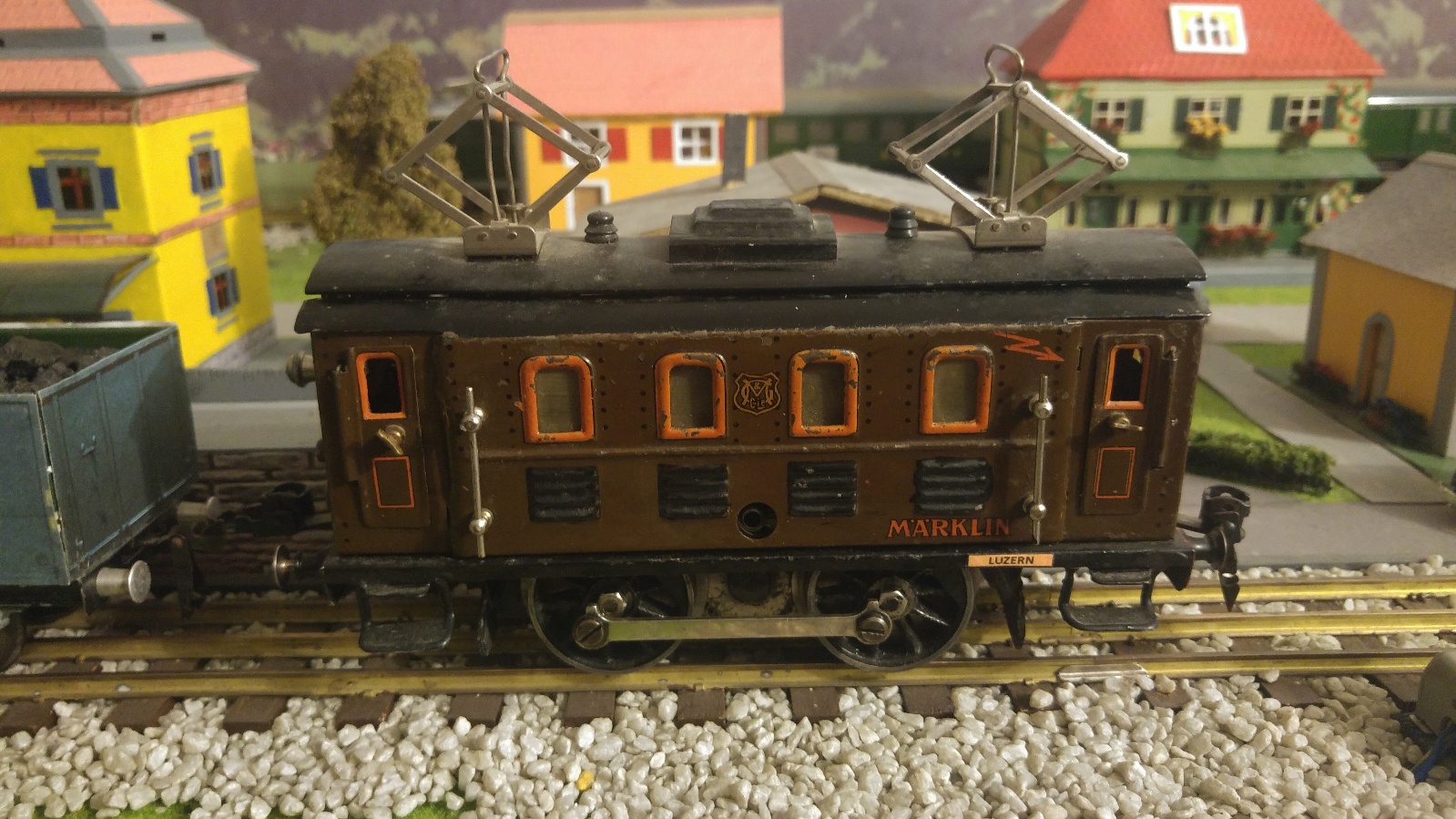 Enfin, voici une vue de l’une des deux parois latérales de ma RS 65/13050 de MAERKLIN, sensée représenter, toutefois en fort simplifié, les locomotives Be 4/6 de la Ligne du Saint-Gothard, ici en arborant sa plaque de dépôt de LUZERN
