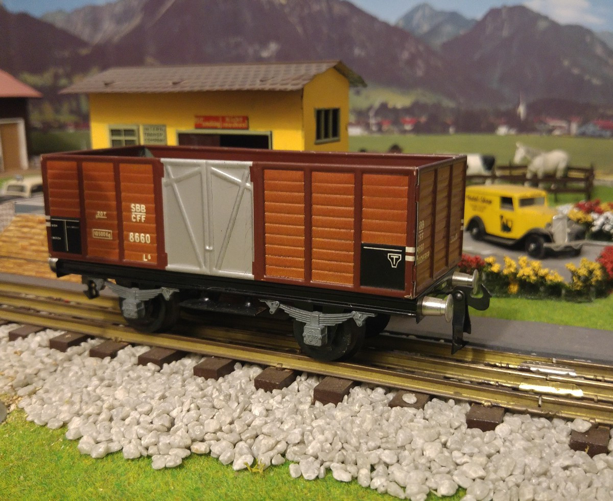 En possession de deux L6 gris et rouge-brun, tous deux munis de leur vigie originale au style modernisé 1940/1950, j’ai donc procédé à la modification de celles-ci en style CFF classique, conformément au chapitre précédent, ainsi qu’à la pose de la paire de marche-pieds latéraux d'accès (également de style classique) aux portes à vantaux. En ce qui concerne les wagons ouverts L6 originaux de BUCO, leur couleur grise affichait en réalité une teinte plus ou moins gris-verdâtre, soit une sorte de "feldgrau", très difficile à reproduire; c’est la raison pour laquelle, j’ai peint la vigie de garde-freins en gris-clair, d'où cette légère différence de couleur par rapport à la caisse du wagon.