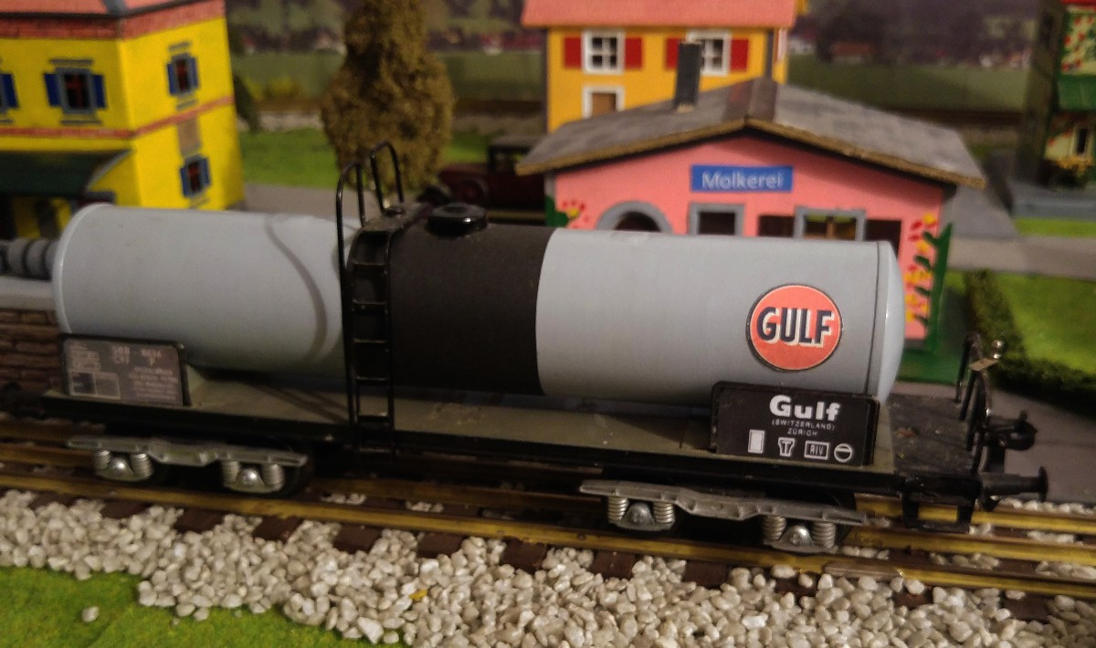 Ce wagon a ainsi été remis en état de façon à ce qu'il soit compatible avec le matériel roulant de mon réseau. Toujours dans le but d'encore augmenter la variété des marques de carburant, il arbore désormais les anciens emblèmes de forme circulaire de la marque de carburant GULF (en provenance d’Internet), ainsi que les plaques de la raison sociale de cette marque, raison sociale prélevée par photographie sur la production BUCO Bauma actuelle, mise au format (17 mm. de haut et 36 mm. de long) au moyen de l’application “Excel” de mon PC et impression finale sur papier blanc de 80 gr/m2; bien évidemment, les plaques d'immatriculation CFF sont également parfaitement conformes au wagon. A titre de précisions complémentaires, tous les wagons-citernes CFF à quatre essieux, ne comportent qu’un seul dôme central de remplissage, ainsi que de la plateforme ouverte avec manivelle de frein visible; par contre, ils n’ont jamais été munis d’une vigie de garde-freins, ni fabriqués avec châssis court sans plateforme.