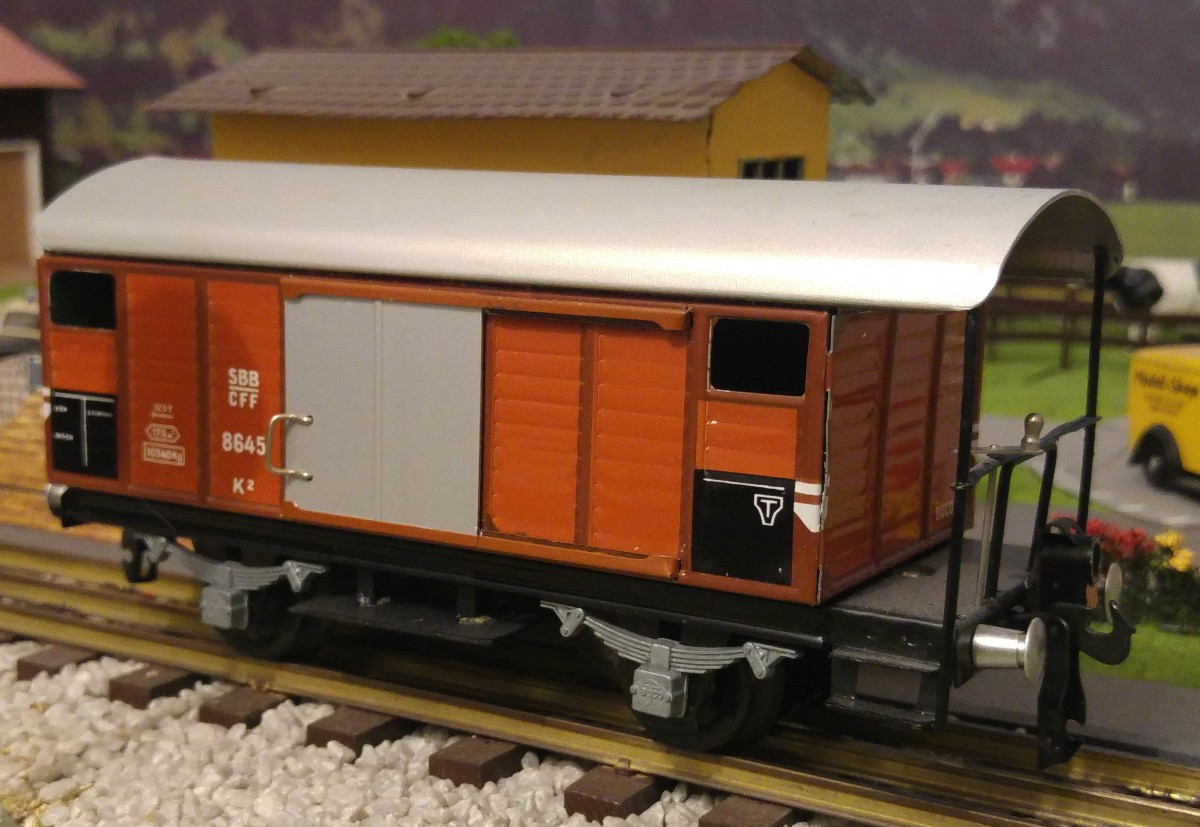 Il est également possible de monter une caisse de wagon K2 No 8644 (sans plateforme, ce qui n’a jamais existé dans la réalité), mais par contre avec avec toit de 16,5 cm de longueur, le tout sur un châssis de 18 cm. de longueur hors tampons, avec plateforme ouverte et manivelle de frein.