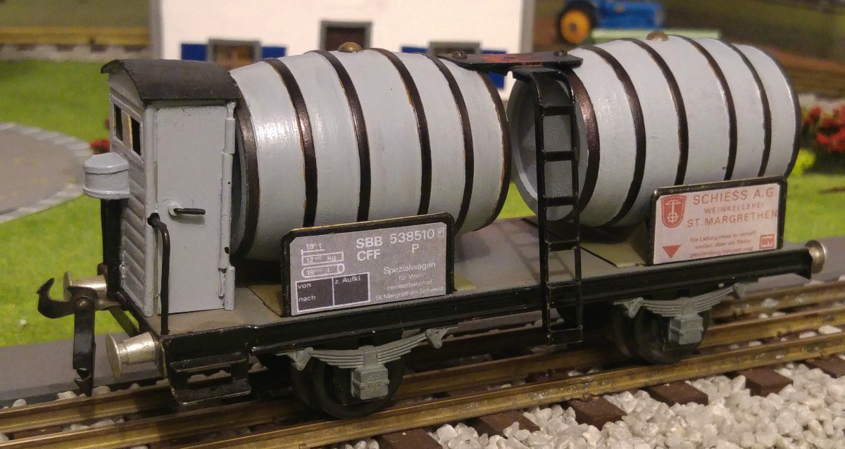 Ce type de wagon, sans plateforme ouverte ou avec vigie modernisée de garde-freins ne correspond pas à la réalité helvétique. Pour être conformes, les deux foudres, la paire d'échelles centrales, ainsi que les deux supports avec plaques d'immatriculation et de raison sociale de ce wagon doivent être transférés sur un châssis de 18 cm de longueur hors tampons, muni d'une plateforme ouverte avec manivelle de frein visible ou d’une vigie classique de couleur grise. Quant aux foudres, ils doivent être peints en gris-clair avec cercles noirs. Suite à ces diverses modifications, le wagon est terminé. Ce wagon fut le seul de la marque a être muni d’une plaque d’immatriculation avec numéro CFF exact, qui correspondait à la raison sociale de son propriétaire.