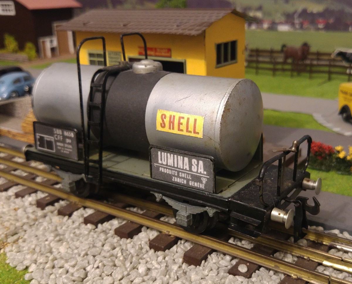 Seul entre en considération le wagon-citerne de cette marque avec plateforme ouverte et manivelle de frein visible ou muni d’une vigie de garde-freins conforme, les plaques d'immatriculation CFF et de raison sociale étant déjà d'emblée réalistes; les wagons, sans plateforme ou avec vigie modernisée de garde-freins, ne correspondent pas à la réalité helvétique. Par contre, la couleur jaune doit impérativement être remplacée par le gris-clair ou le gris-argent, car il n'y a jamais eu de wagon-citerne SHELL avec bonde de couleur jaune sur les chemins de fer suisses. Là également, à choix application ou non de la bande noire centrale. En cas d'application de la bande noire centrale, l'emblème "SHELL" doit par contre être à nouveau confectionné et placé tout à droite de la bonde. Suite à cette ou à ces deux modifications, le wagon est terminé.