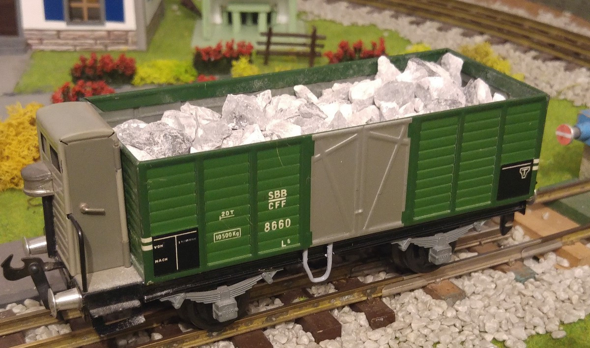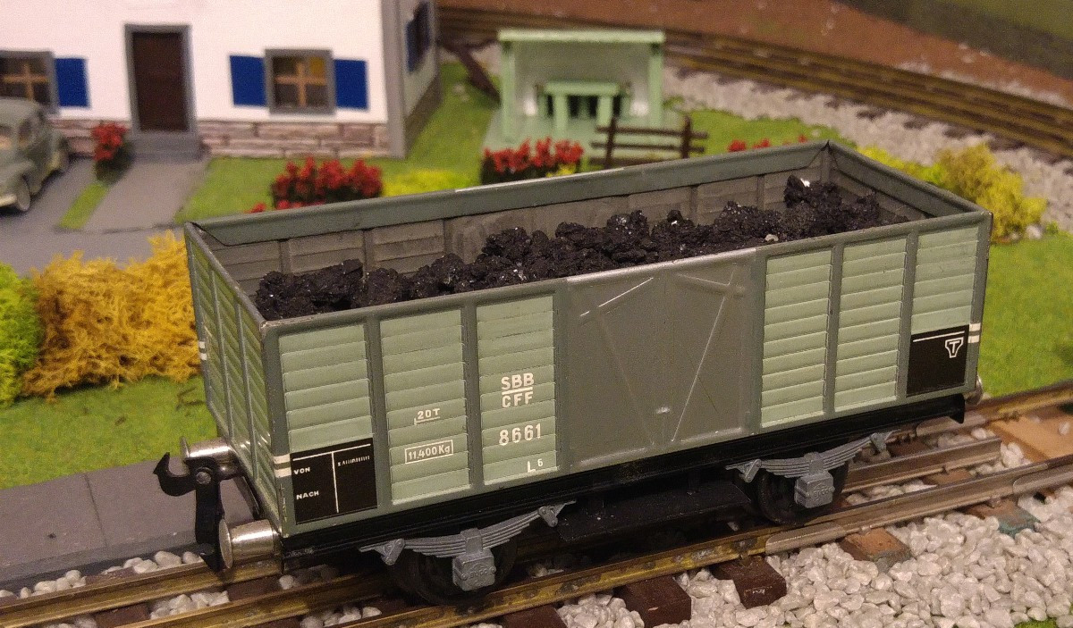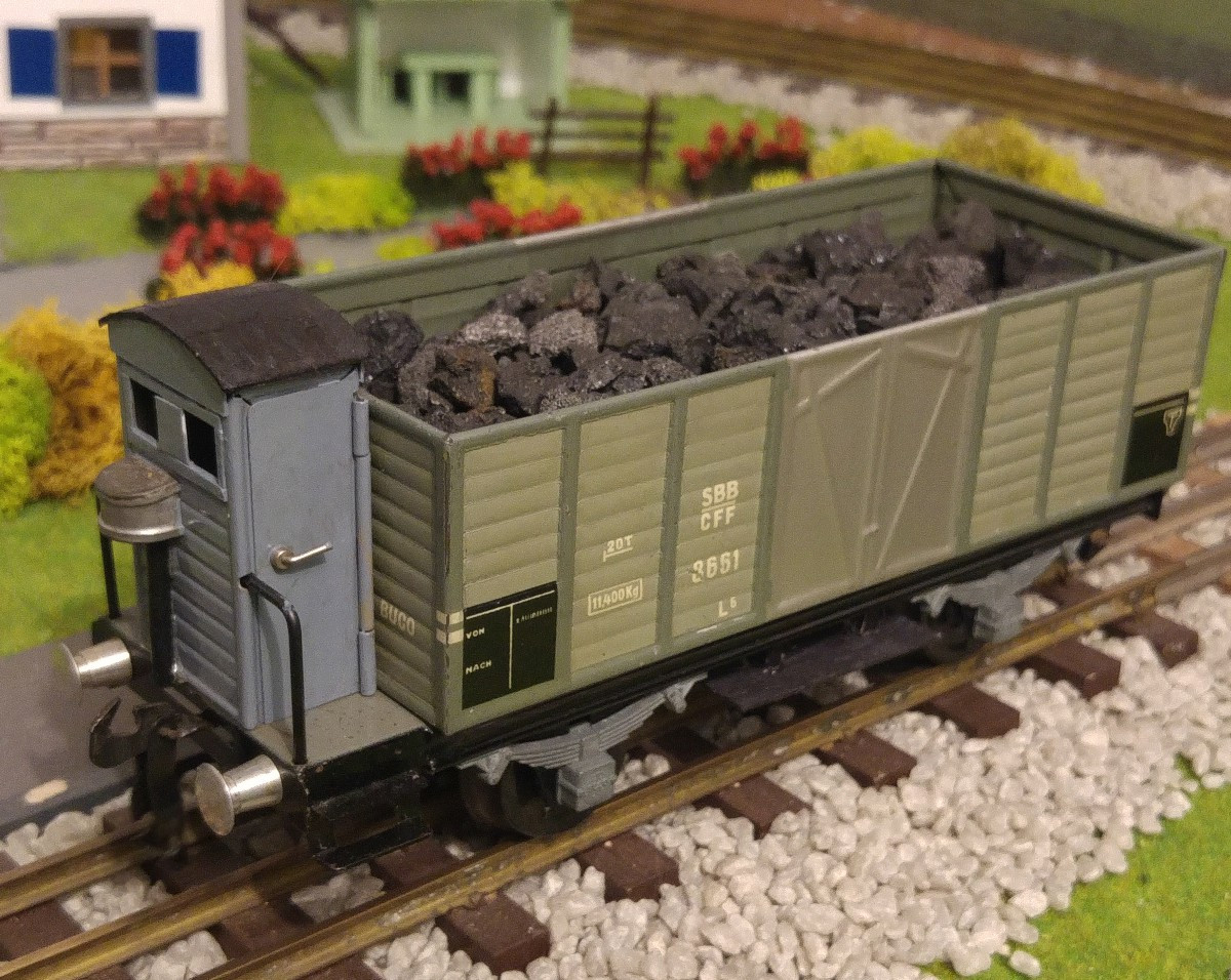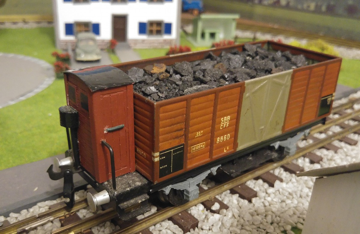 Ci-dessus, wagon tombereau L6 8661 de couleur grise (chargé de charbon concassé en provenance du Chemin de fer-Musée Blonay - Chamby) et muni de sa paire de marche-pieds classiques. Ce wagon n’a par contre jamais été produit par BUCO sous cette couleur, le wagon 8661 ayant été muni d’origine d’une vigie de garde-freins. Le châssis avec vigie a été utilisé pour un autre wagon; quant à la caisse, elle a été transférée sur un châssis court de 16 cm de longueur hors tampons. Ci-dessous, un wagon L6 8660 original de couleur rouge-brun ayant bénéficié d’une amélioration semblable