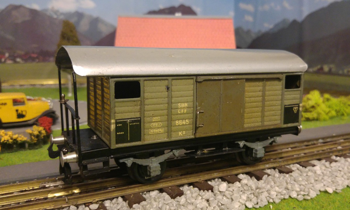 Quant à un wagon K2 gris en ma possession, la vigie de garde-freins, acquise chez Peter Wülser, a été montée sur la plateforme d'origine, dont la manivelle de frein visible a été retirée mais conservée, alors que les rambardes frontales ont été partiellement démontées; cela a nécessité la surélévation, à partir du sommet du toit de la vigie originale, de 8 mm. en son centre et de 6 mm. sur les côtés, de façon à ce qu'elle s'imbrique parfaitement dans la courbure du toit, puis finalement à l'application de la couleur grise sur celle-ci, sans omettre la pose de la colonne de frein. Au titre des ultimes opérations, j'ai procédé à la pose de la paire de marche-pieds latéraux d'accès aux portes centrales; à titre de variante, à l’aide de cartons, j’ai également reproduit les volets d’aération en position fermée et semi-fermée. Ainsi amélioré, ce wagon est désormais terminé. En ce qui concerne les wagons couverts K2 originaux de BUCO, leur couleur grise affichait en réalité une teinte plus ou moins gris-verdâtre, soit une sorte de "feldgrau", très difficile à reproduire; c’est la raison pour laquelle, j’ai peint la vigie de garde-freins en gris-clair, d'où cette légère différence de couleur par rapport à la caisse du wagon.