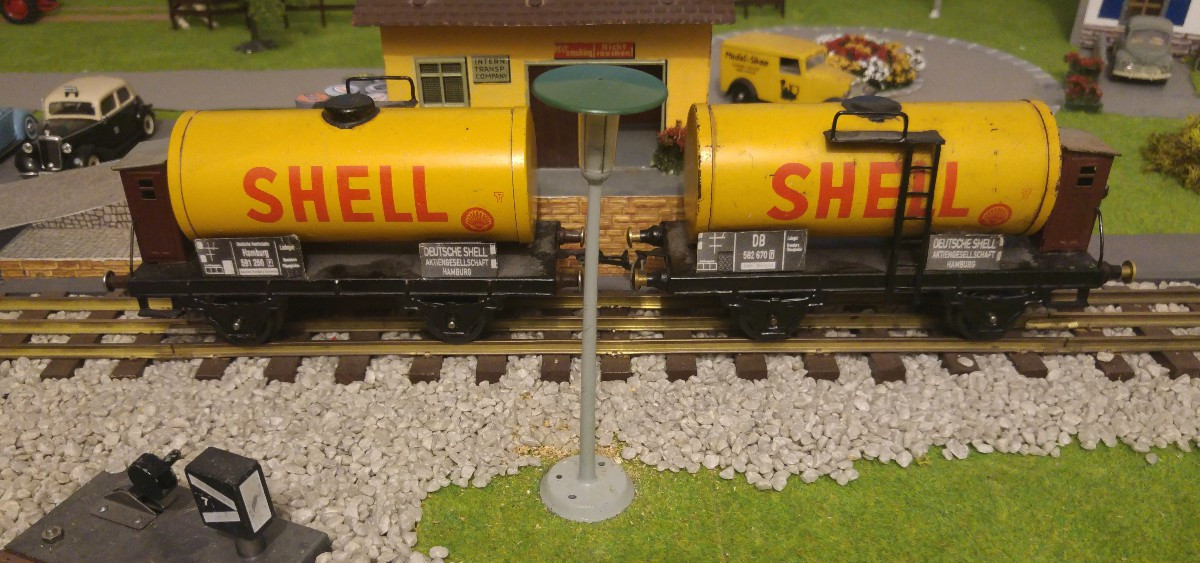 En possession de deux wagons DB SHELL de FLEISCHMANN, j’ai procédé à leur amélioration; de ce fait, grâce à l'Internet, il m'a été possible de réaliser des plaques allemandes conformes mais distinctes pour chacun des deux wagons, plaques imprimées sur papier satiné de 100 gr/m2 et recouvrant les plaques originales. Ensuite, j’ai procédé à l’adjonction de deux escaliers d'extrémité BUCO, nécessaires à l'accès à la plateforme avec vigie de garde-freins, ainsi qu’à la confection d'une simple tige verticale peinte en noir (sensée reproduire la colonne du frein à main), reliant la partie inférieure du « nez » de la vigie à la partie supérieure du châssis. Une rambarde de sécurité a été ajoutée en bordure de la plateforme centrale supérieure d'accès à l'orifice de remplissage de la bonde.
