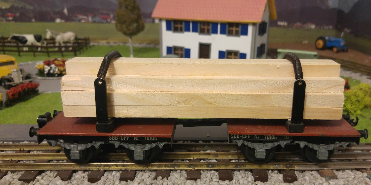 Ce wagon, destiné au transport de longs bois ou d’autres chargements longs et rigides tels que des poutrelles métalliques, etc., est formé de deux chariots à deux essieux de faible longueur, munis d'une paire de ranchers pivotants au centre de chacun des deux chariots, qui sont réunis par une barre d'attelage de longueur réglable, permettant ainsi à ce « wagon double » de transporter des éléments d’une pièce de très grande longueur et ne pouvant donc pas être placés sur un wagon plat à deux ou à quatre essieux de longueur habituelle. Pour la petite histoire, alors que tous les wagons marchandises BUCO sont munis d'un marquage CFF, tout d'abord simplifié pour les premiers wagons produits (wagons-citernes à deux essieux et bi-foudres), puis enfin nettement plus réaliste au fil des années, le N2 n'a, par contre, jamais été muni de la moindre immatriculation ; c'est la raison pour laquelle, j'ai réalisé ces inscriptions (toutefois quelque peu simplifiées par rapport au wagon original) au moyen du fichier « Excel » de mon PC, en me basant sur une photographie du wagon réel, afin que ce modèle soit compatible avec ceux de ma collection, soit : SBB-CFF, N2, 70101 A (premier chariot) et SBB-CFF, N2, 70101 B + le sigle encadré « T » (autorisant le trafic international) sur le deuxième chariot. Ainsi terminé, il a fière allure. Selon le Règlement sur la Circulation des Trains (RCT), en raison de sa conception particulière (entre autres dans la réalité absence de frein à air comprimé – seuls figurent la paire de boyaux de la "conduite blanche", ainsi que les freins extérieurs d'immobilisation manuellement actionnés par un levier latéral sur chacun des chariots -), ce wagon doit obligatoirement être placé en queue de convoi.