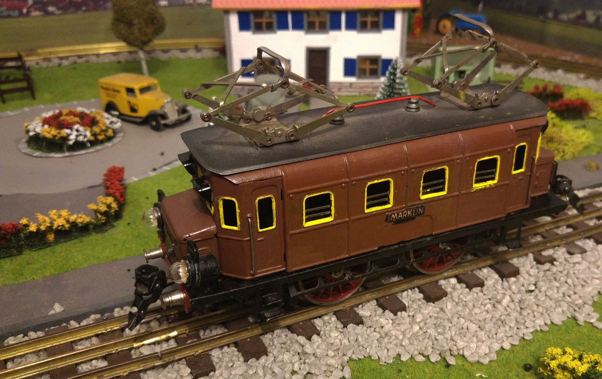Arborant désormais fièrement ses nouveaux atours, qui rappellent effectivement que les 114 unités de la série (10301 à 10326, renumérotées 10601 à 10626, puis 10627 à 10714) sont toutes sorties d’usine entre 1921 et 1929 à la couleur brune; les inscriptions en lettres or sur fond noir, apparaissent clairement. Sur la paroi latérale apparaît l’inscription unique de “MAERKLIN”. Les deux bouchons du porte-charbons, placés au-dessous de l’inscription “MAERKLIN”, ont été recouverts d’une feuille de carton, ceci dans un but personnel de l’amélioration esthétique