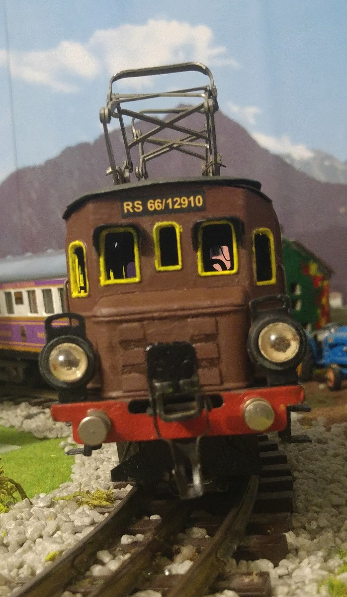 Ce modèle arbore désormais une robe brune, alors que les roues ont conservé leur couleur originale rouge-foncé. En ce qui concerne les fameuses “visières” pare-soleil, surplombant les grandes fenêtres des parois frontales (appliquées dans la réalité sur les Ae 3/6 I de la série 10617 à 10676), la couleur noire d’origine a non seulement été maintenue, mais également rénovée, ceci afin de rendre ces visières plus visibles, alors que les cadres de toutes les fenêtres frontales et latérales ont été repeints en jaune, comme cela apparaissait déjà à l’origine avec la couleur verte. La persienne frontale d’aération de couleur verte, que j’avais ajoutée après coup, a été remplacée par un nouveau type en relief, correspondant aux locomotives Ae 3/6 I CFF de la série 10637 à 10714. Si j’ai choisi ce type de persiennes, c’est en raison du fait qu’elles ne se rencontraient uniquement que sur les Ae 3/6 I désignées ci-dessus, ainsi que sur les De 6/6 CFF, datant de 1926 (série 15301 à 15303) et principalement construites pour la Ligne du Seetal (Lucerne - Wildegg); actuellement, seule la 15301, remisée au Dépôt de Brugg AG, a été conservée en parfait état de marche auprès de CFF-Historic. Finalement, j’ai confectionné, imprimé et apposé les inscriptions typiques de MAERKLIN qui avaient disparu, soit “RS 66/12910” au-dessus des fenêtres frontales, “MAERKLIN et RS” sur une des parois latérales et “MAERKLIN” seulement sur la paroi adverse.