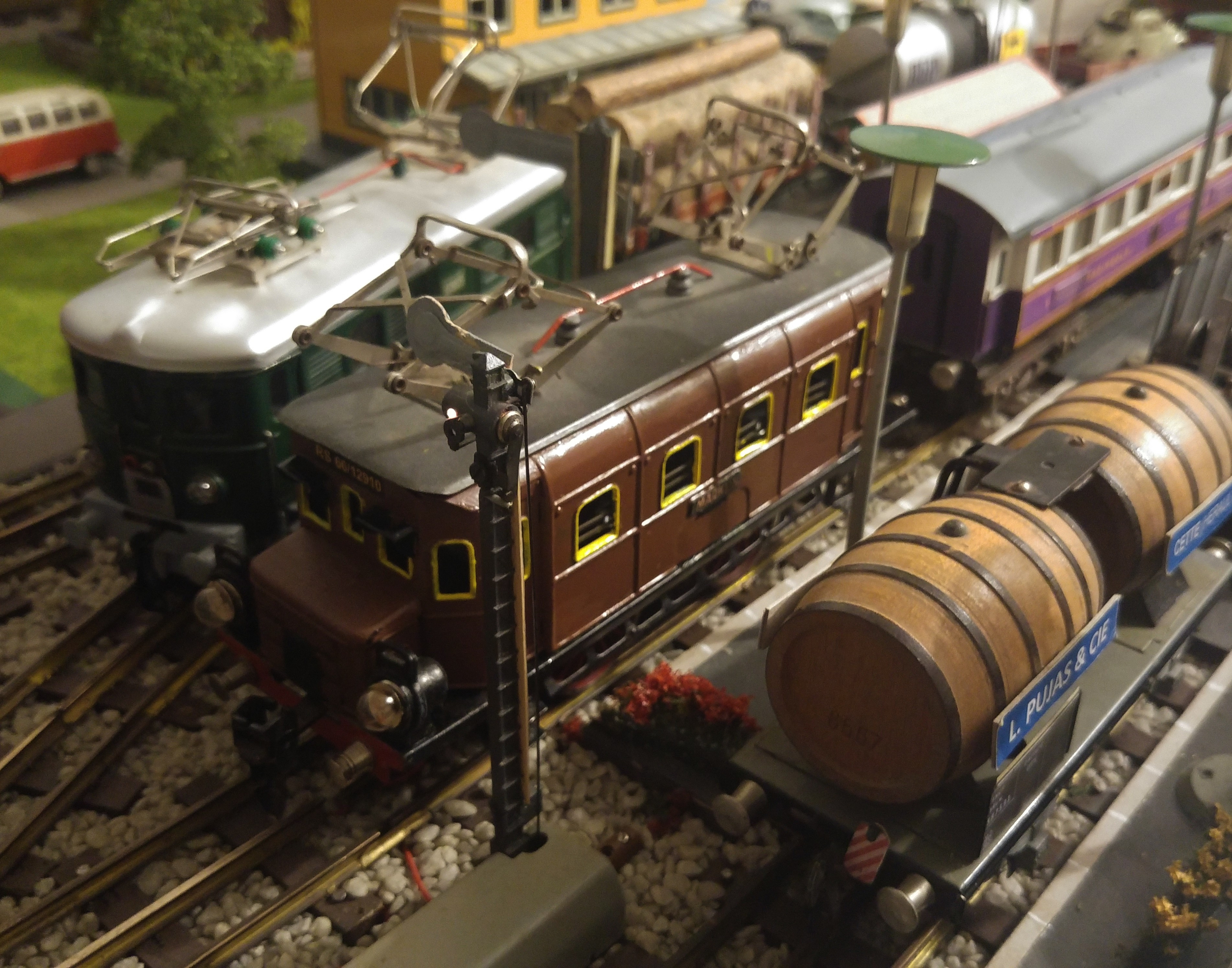 Ce modèle arbore désormais une robe brune, alors que les roues ont conservé leur couleur originale rouge-foncé. En ce qui concerne les fameuses “visières” pare-soleil, surplombant les grandes fenêtres des parois frontales (appliquées dans la réalité sur les Ae 3/6 I de la série 10617 à 10676), la couleur noire d’origine a non seulement été maintenue, mais également rénovée, ceci afin de rendre ces visières plus visibles, alors que les cadres de toutes les fenêtres frontales et latérales ont été repeints en jaune, comme cela apparaissait déjà à l’origine avec la couleur verte. La persienne frontale d’aération de couleur verte, que j’avais ajoutée après coup, a été remplacée par un nouveau type en relief, correspondant aux locomotives Ae 3/6 I CFF de la série 10637 à 10714. Si j’ai choisi ce type de persiennes, c’est en raison du fait qu’elles ne se rencontraient uniquement que sur les Ae 3/6 I désignées ci-dessus, ainsi que sur les De 6/6 CFF, datant de 1926 (série 15301 à 15303) et principalement construites pour la Ligne du Seetal (Lucerne - Wildegg); actuellement, seule la 15301, remisée au Dépôt de Brugg AG, a été conservée en parfait état de marche auprès de CFF-Historic. Finalement, j’ai confectionné, imprimé et apposé les inscriptions typiques de MAERKLIN qui avaient disparu, soit “RS 66/12910” au-dessus des fenêtres frontales, “MAERKLIN et RS” sur une des parois latérales et “MAERKLIN” seulement sur la paroi adverse.