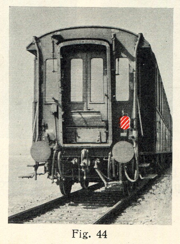 Ces signaux “de jour” sont confectionnés en transférant sur “Excel” l’illustration selon figure No 44 et parue au bas de la la page 27 du Règlement des Signaux (R 71) du 1er mai 1947. Les dimensions de ces signaux sont de 7 mm. de large sur 12 mm. de hauteur; conformément au Règlement cité ci-dessus, ils sont placés à droite du crochet d’attelage, près du tampon correspondant, ceci de façon à ce que le mouvement latéral dudit crochet ne soit pas entravé lors du franchissement des courbes de faible rayon. Dans un but purement esthétique, en ce qui concerne les wagons munis d’une plateforme ouverte avec manivelle de frein extérieure ou d’une vigie de garde-freins, ces signaux de queue sont exclusivement placés du côté des plateformes et des vigies; en effet, il est nettement plus esthétique que le dernier wagon du convoi soit toujours placé de façon à ce que sa plateforme ouverte avec la manivelle de frein extérieure ou sa vigie de garde-freins soit parfaitement visible, un peu comme si ce wagon “regardait le paysage qui défile”. Au sujet des wagons sans plateforme ni vigie, seul un signal de queue “de jour” y figure.