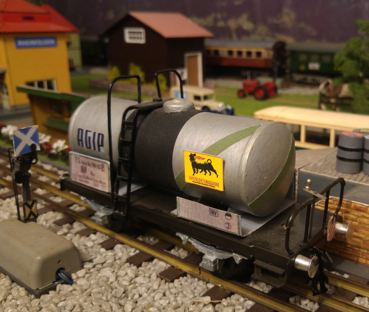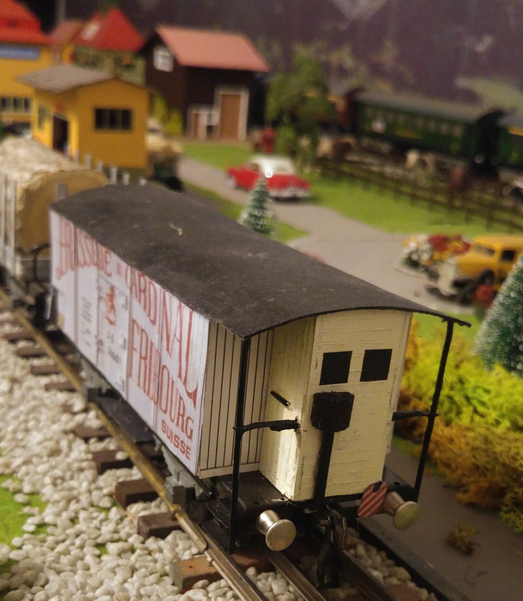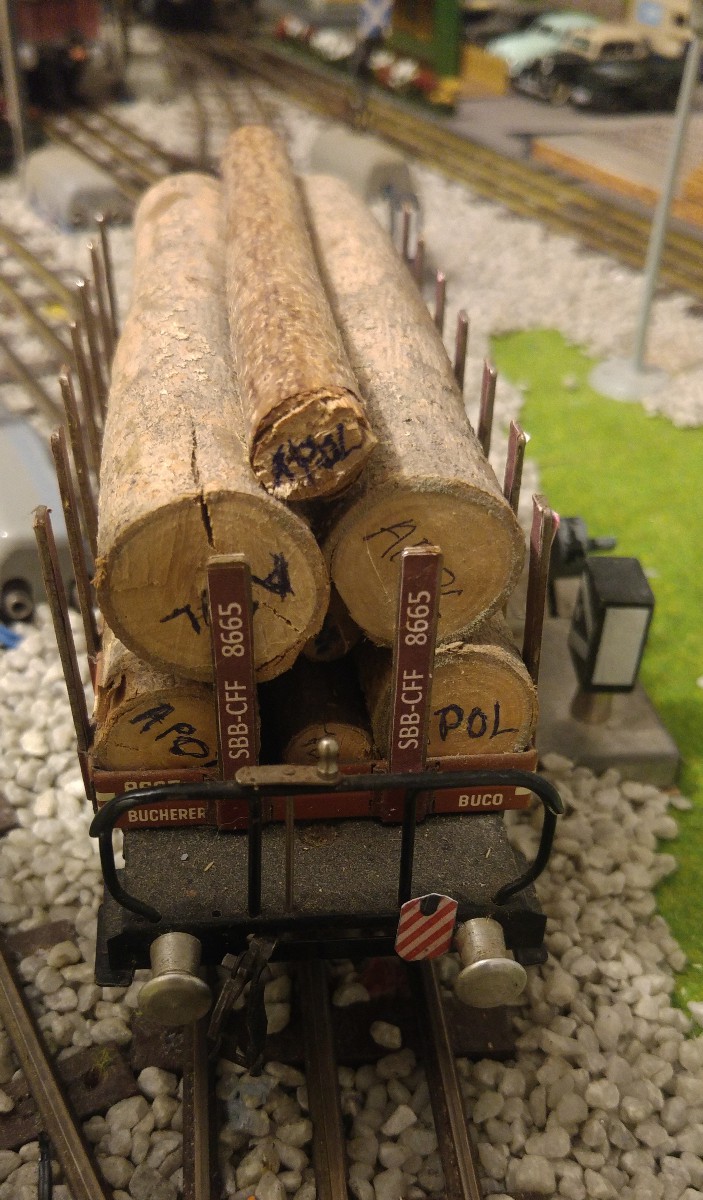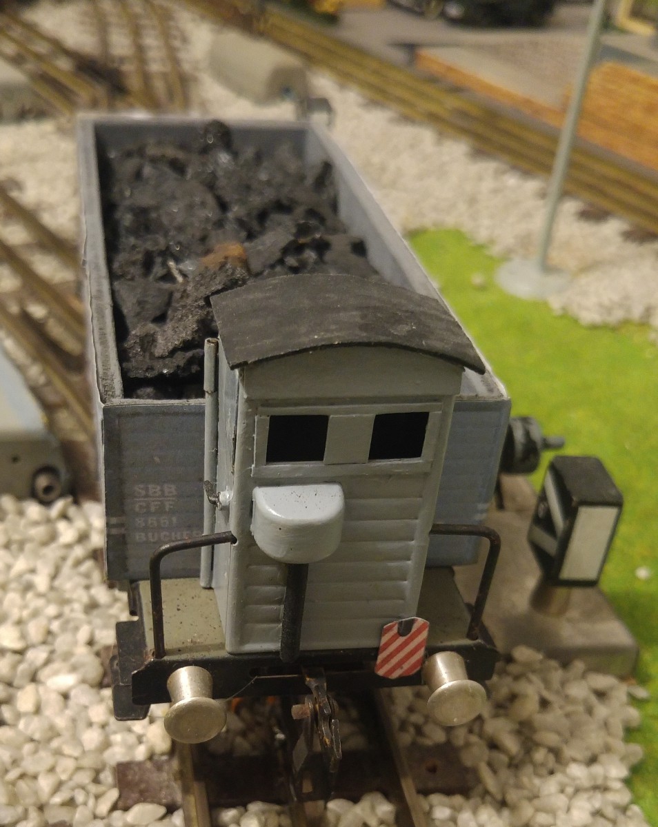 Dans le but de faciliter la mise en place des wagons de marchandises et donc finalement l’exploitation de mon réseau Tinplate 0, j’ai entrepris l’impression sur papier satiné de 100 gr./m2 et la pose par collage sur du carton de 0,5 mm. d’épaisseur de signaux de queue “de jour” sur l’ensemble de mes wagons en question. Par contre, quatre wagons de marchandises ont d’emblée été munis à demeure d’un signal de queue avec lanterne éclairée au moyen d’un frotteur central fixé sous le plancher du wagon (signal HO de MAERKLIN); ces wagons sont les suivants: un K2 gris avec vigie de garde-freins et un K2 brun avec plateforme ouverte et manivelle de frein extérieure, tous deux avec caisse réalisée par mes soins, ainsi que le wagon-citerne ESSO de la marque ERNO avec vigie de garde-freins CFF exacte et le wagon “longs bois” de BUCO, formé de deux chariots pivotants et reliés par une traverse centrale du type N2; conformément au Règlement sur la Circulation des Trains (RCT), ce dernier type de wagon doit TOUJOURS être placé en queue d’un train.