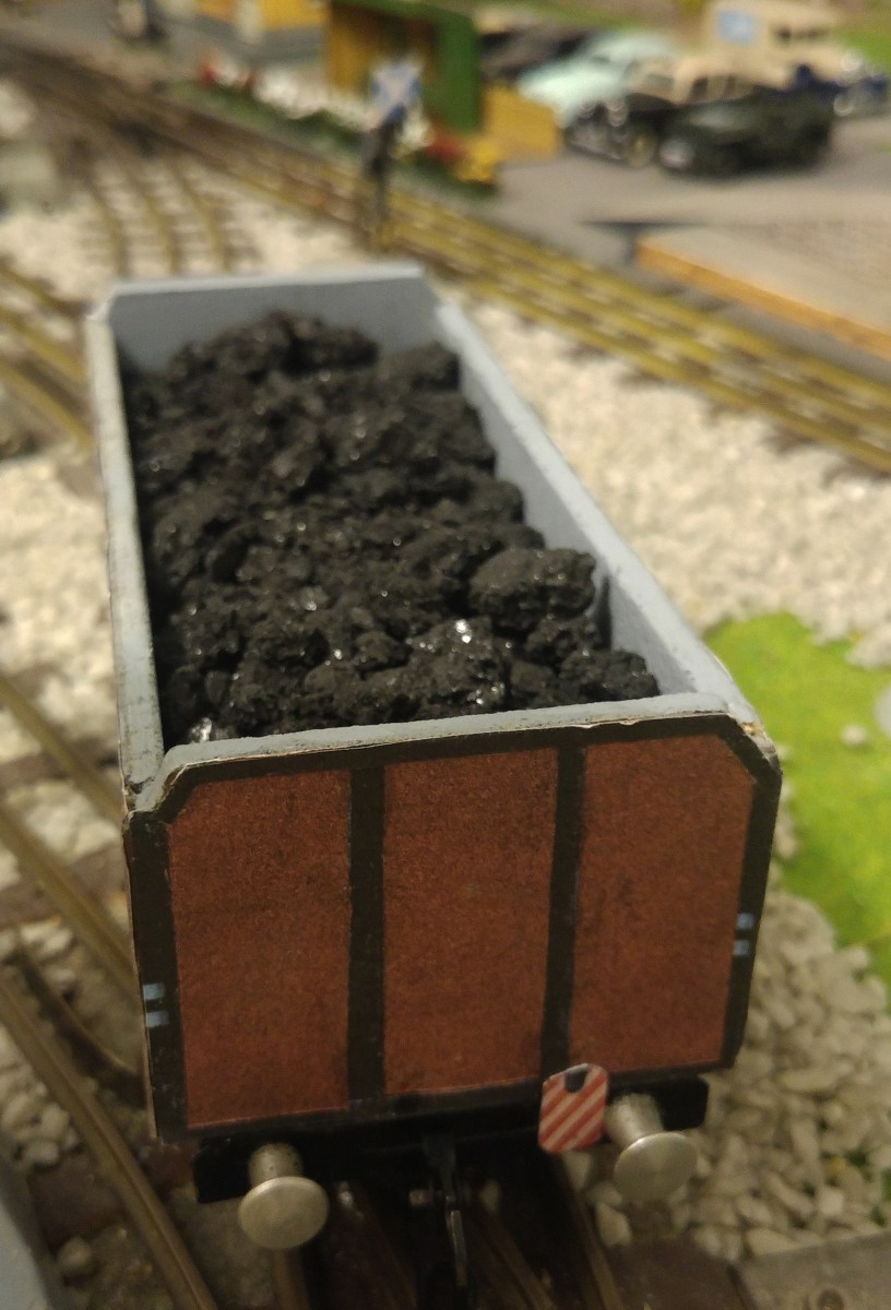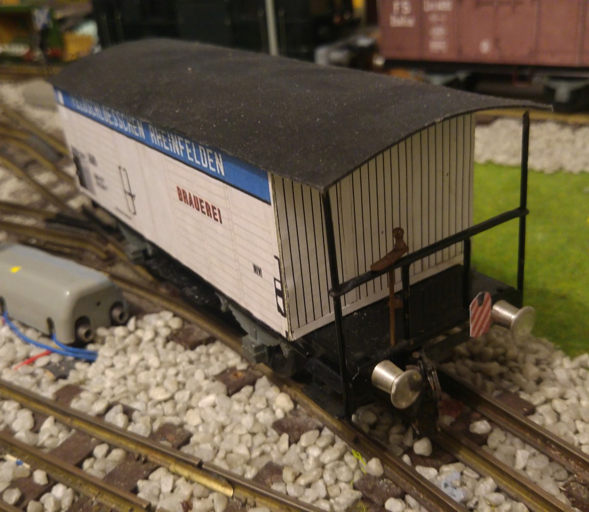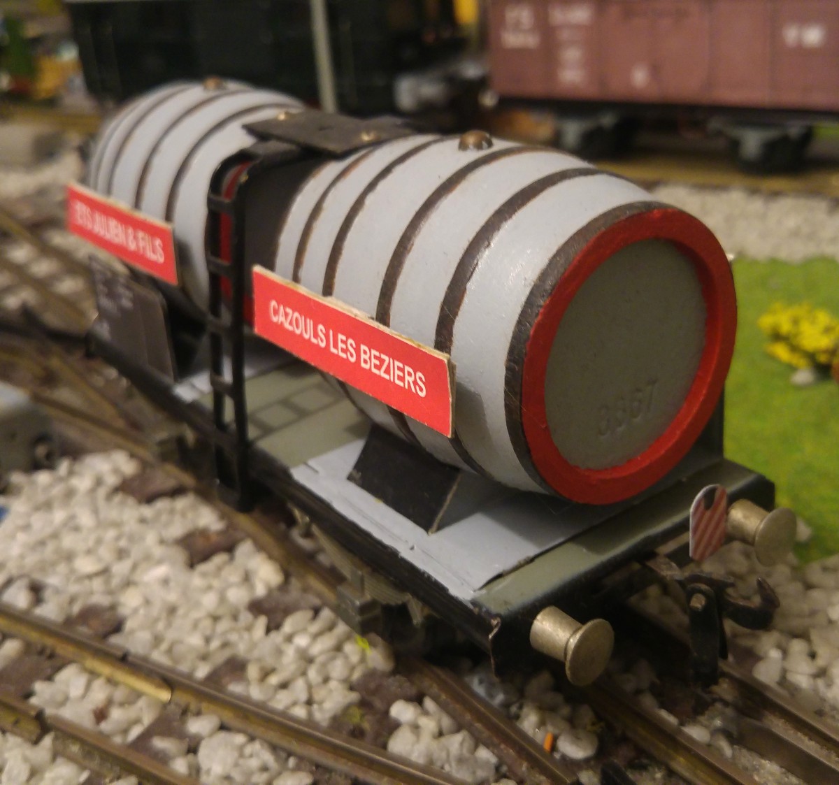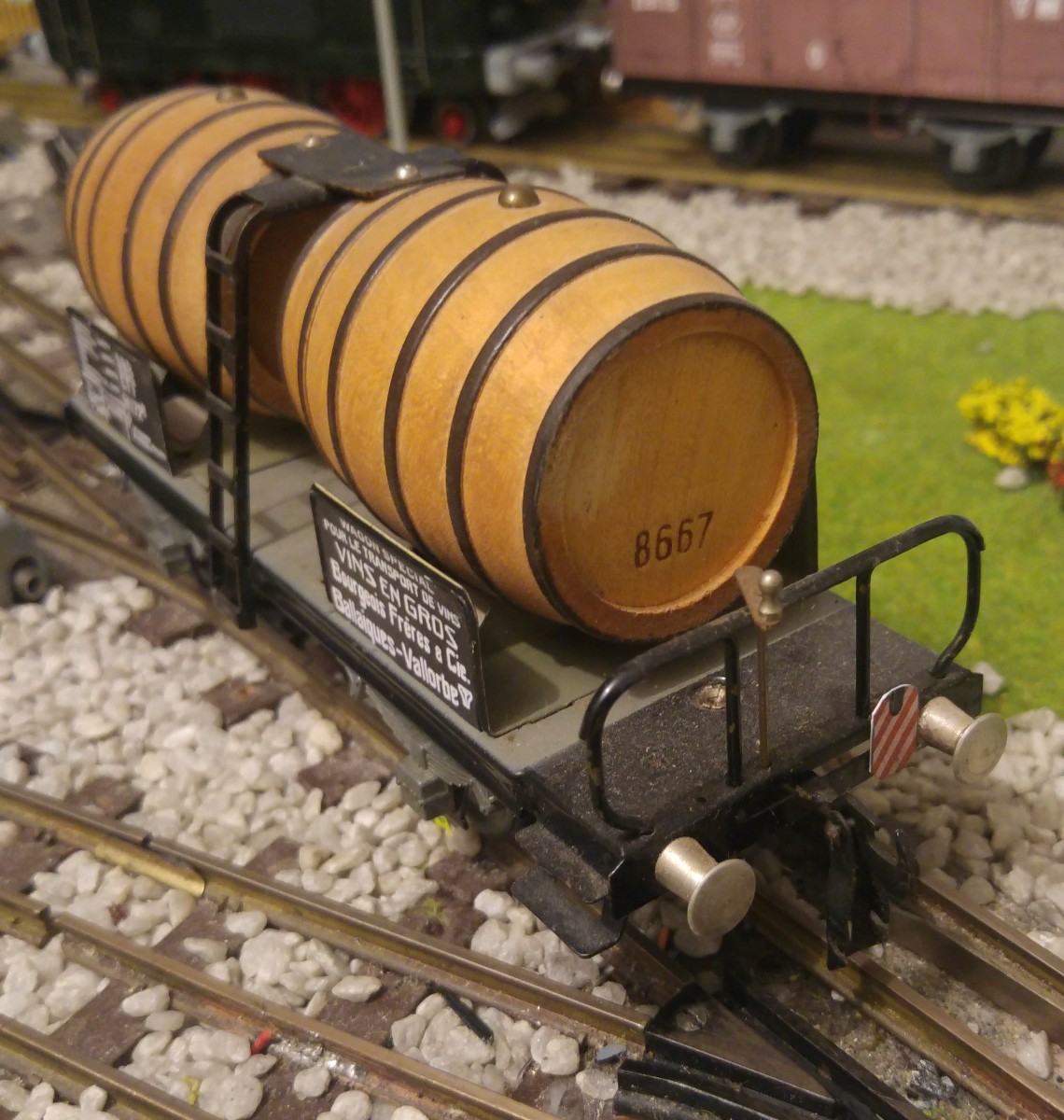Dans le but de faciliter la mise en place des wagons de marchandises et donc finalement l’exploitation de mon réseau Tinplate 0, j’ai entrepris l’impression sur papier satiné de 100 gr./m2 et la pose par collage sur du carton de 0,5 mm. d’épaisseur de signaux de queue “de jour” sur l’ensemble de mes wagons en question. Par contre, quatre wagons de marchandises ont d’emblée été munis à demeure d’un signal de queue avec lanterne éclairée au moyen d’un frotteur central fixé sous le plancher du wagon (signal HO de MAERKLIN); ces wagons sont les suivants: un K2 gris avec vigie de garde-freins et un K2 brun avec plateforme ouverte et manivelle de frein extérieure, tous deux avec caisse réalisée par mes soins, ainsi que le wagon-citerne ESSO de la marque ERNO avec vigie de garde-freins CFF exacte et le wagon “longs bois” de BUCO, formé de deux chariots pivotants et reliés par une traverse centrale du type N2; conformément au Règlement sur la Circulation des Trains (RCT), ce dernier type de wagon doit TOUJOURS être placé en queue d’un train.