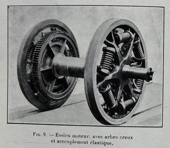 Ci-dessus, voici l’aspect d’un essieu moteur pour locomotives CFF Be 4/7, Ae 3/5 et Ae 3/6 III, dont le diamètre des roues s’élève à 1610 mm.. Ci-dessous, l’essieu moteur central de l’Ae 3/5 10203, prêt à être retiré du châssis; chaque essieu était entraîné unilatéralement par deux moteurs jumeaux de traction de 300 CV chacun et couplés en série, moteurs ici légèrement visibles derrière la roue. Les essieux moteurs et porteurs étaient interchangeables entre ces trois types de locomotives. Les moteurs de traction des “10200” Ae 3/5 et Ae 3/6 III étaient identiques, alors que ceux des Be 4/7 étaient en outre équipés pour le freinage électrique sur résistances et ne convenaient donc qu’à ce type de machine, ceci en raison des couplages des inverseurs de marche, qui étaient donc différents par rapport à ceux des “10200”, non munies du frein électrique. La puissance des “10200” était de 1’800 CV, alors que celle des Be 4/7 était de 2’400 CV
